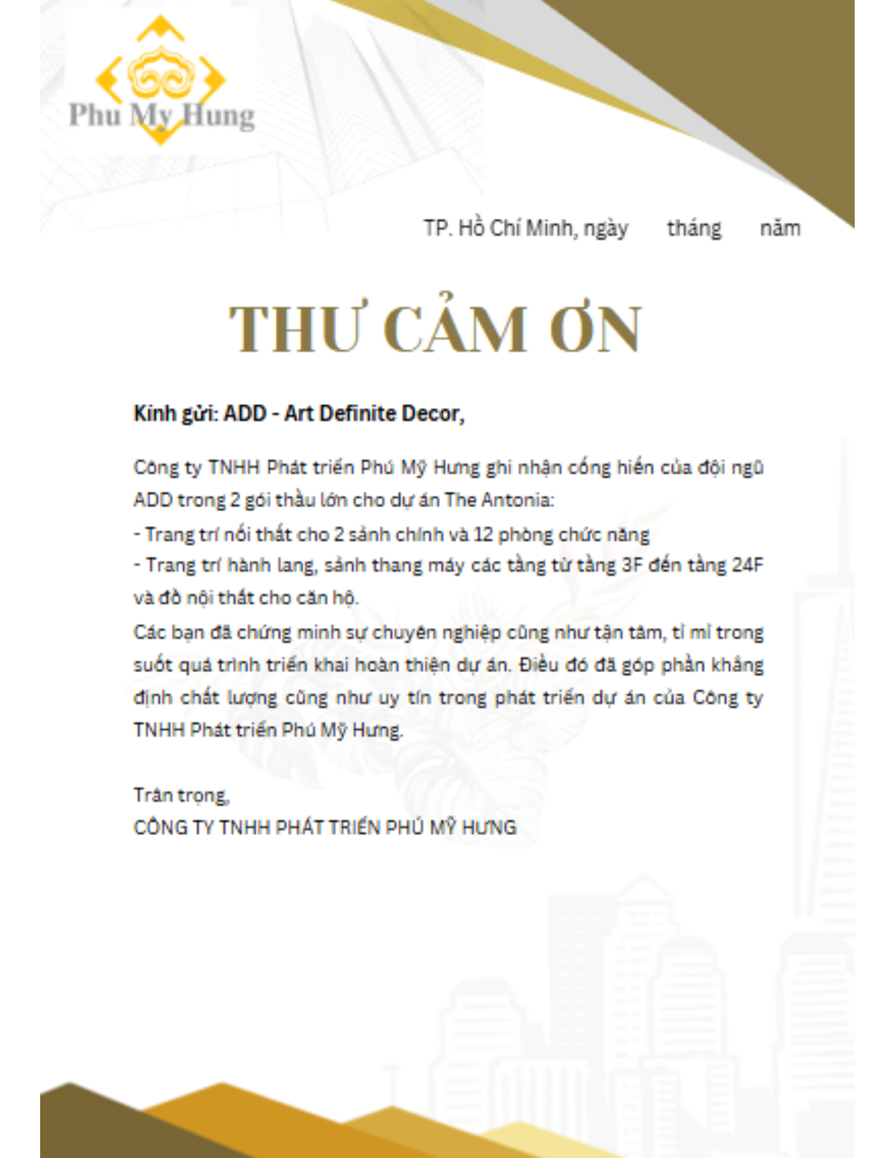 Công ty TNHH Phát triển Phú Mỹ Hưng ghi nhận cống hiến của đội ngũ ADD trong 2 gói thầu lớn cho dự án The Antonia